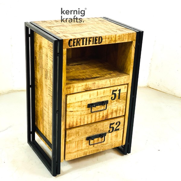 Night Stand with Rough Sawn finish on Mango wood. Accent wood crafts based drawer and shelf for storage. The Metal Work gives it a Indus-modern look where as the Honey stain finish on the wood makes it fuse with Vintage furniture. The metal work and wood stain are always customisable with us. Apt for household use.