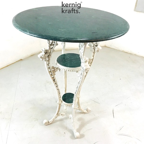 Patio table with Marble top. It is a fusion of industrial and ultra modern furniture. Cast Iron base with Marble ornamentation gives it a luxurious and rich presence. One of our Bespoke furniture work. Metal base colour is customisable and we have many options available for marble also. Delicate yet shipping friendly product. Suitable for exclusive Cafe, Bistro, Restaurant.