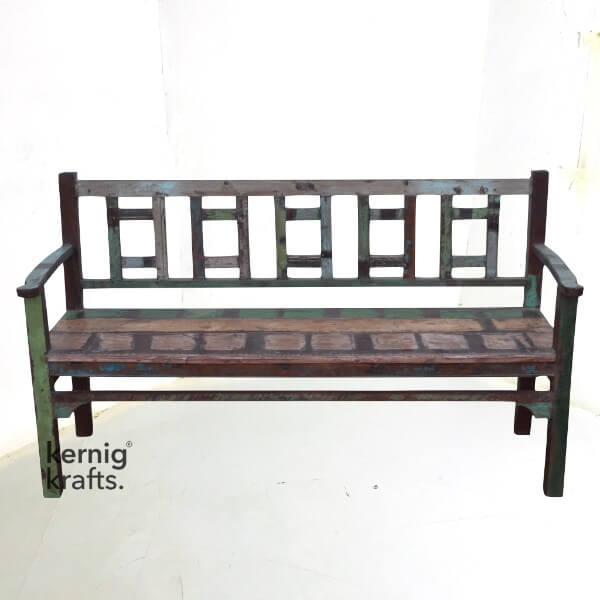 Made from reclaimed wood, this bench gives an Indian touch. The design is customisable, color and finish can be of your choice: distress paint, duco, stained finish with lacquer, melamine or PU.