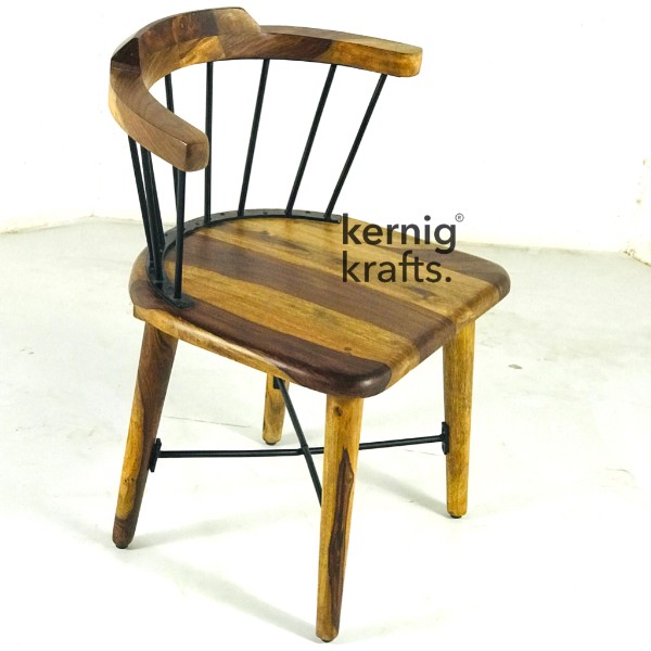 Minimal Stick Chair. The design may look minimal but a lot of engineering has been applied in the execution of this chair. With back as metal spokes. A tad delicate design, but very beautiful. Made in acacia wood only. Cushion can be optional. Color is customisable as per choice of the client.