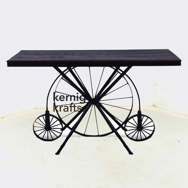 Note : Table Size and color customisable. (bespoke) Cycle design gives a quirky and hip look to your place. Made in Mild Steel and Powder coated in choice of your color. The wooden top will be in any finish and color. Distress finish will look great on this. This furniture Piece Works for outdoor, cafe, restaurant, bistro, cafeteria and roof top areas. Design is very sturdy and come under umbrella of industrial furniture.