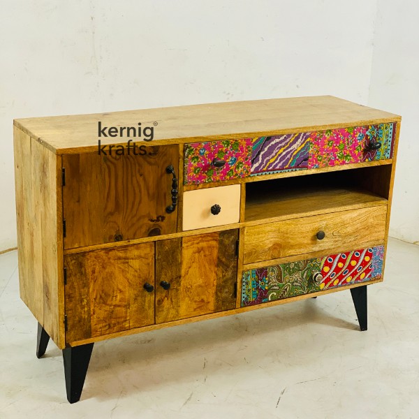 Made with handpicked mango wood. Natural mango finish, the construction is very strong. Rajasthani fabric at the panels of the drawer to give an ethnic and desi look. Finish and size are customisable as per your choice if the order is in bulk.