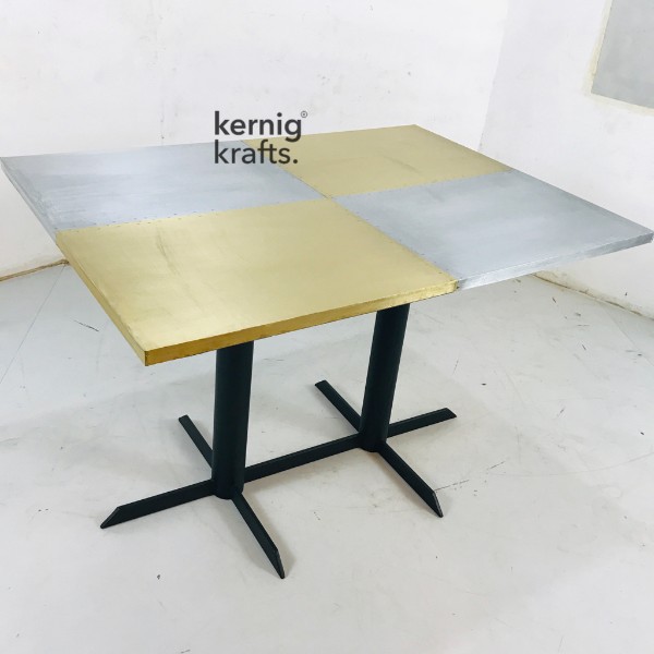 Mild Steel base and solid wooden top. Wood coloured in Gun Metal and Brass chequered arrangement. The base is designed in the centre of the Table so that your legs can have all the freedom movement in all directions. The colour on the top and powder coat on the base can always be customised as per your choice. Apt for Cafe, Restaurants.