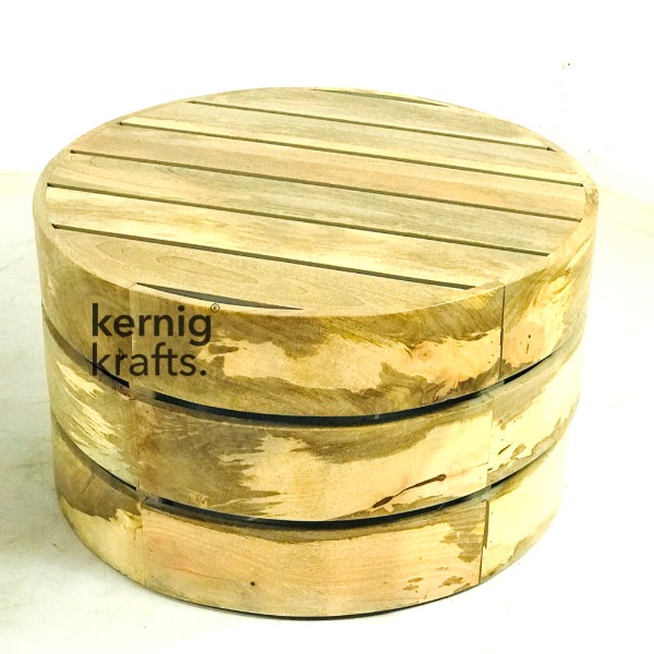 Solid wood cylindrical base and accent wood top. A fusion of Honey Stain on the wood and sand paper finish. Production friendly and durable furniture. Amicable design for all. Wood stain is customisable. Apt for Cafe, Bistro and household also.