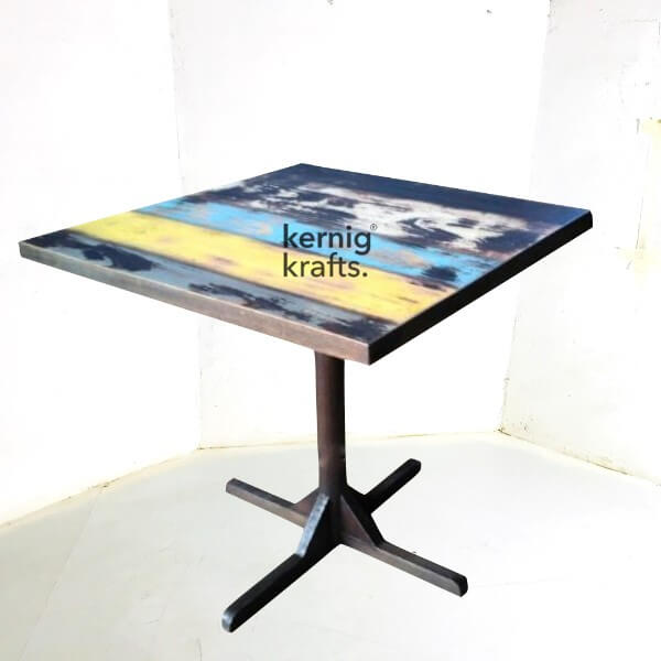 The look is industrial it also can be placed at a minimalistic intervention themed place. looks heavy and strong. Made in Mild Steel and Powder coated in choice of your color. The wooden top will be in any finish and color. This furniture Piece Works for bar, micro brewery, Coffee shop, cafe, restaurant, bistro, cafeteria, home, office table, office furniture and as a conference table as well, where off course it will be bigger in size. Design is very strong and sturdy.