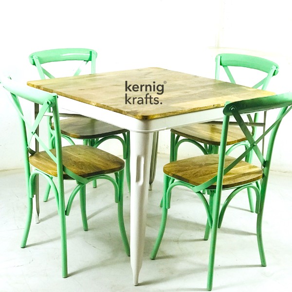 Tolix Dining Table with chairs. The table top and the seat of the chair are made of Mango wood stained in Dark Honey colour. This furniture set can be used outdoors with a little customisation with wood stain. Perfect of cafe, bistro and restaurant based on outdoors seating arrangement. Wood stain and metal powder coat are customisable.