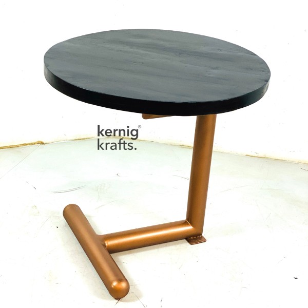 An improvised, unique furniture article. A rare design coffee table with cast iron base and black stain on Solid wooden top. The finish on the base and stain on the wood are customisable. Apt for Cafe, Bistro and restaurant.